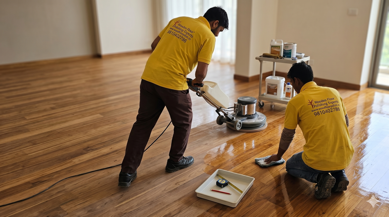 “We revive your wooden floors with advanced polishing techniques, giving them a smooth, glossy, and long-lasting finish.”